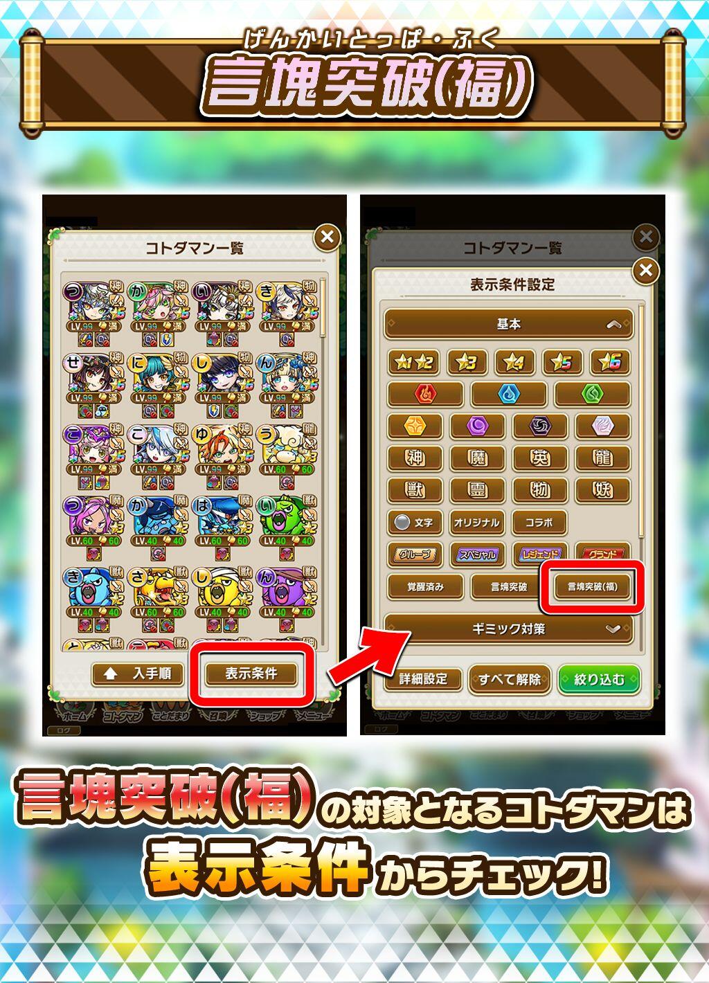 ※対象となるコトダマンを重複して獲得しても、言塊突破(福)の凸の段階を上げることはできません。
