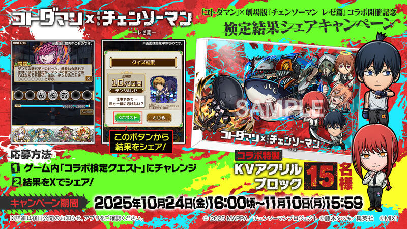 「コトダマン」 × 劇場版『チェンソーマン レゼ篇』コラボ開催記念 検定結果シェアキャンペーン