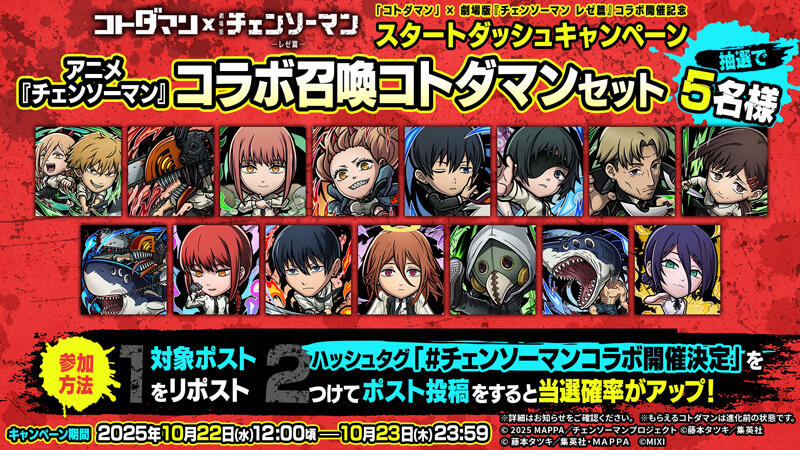 Xにてキャンペーン対象ポストをリポストしてくださった方の中から抽選で5名様に、「アニメ『チェンソーマン』コラボ召喚コトダマンセット」をプレゼントいたします。
