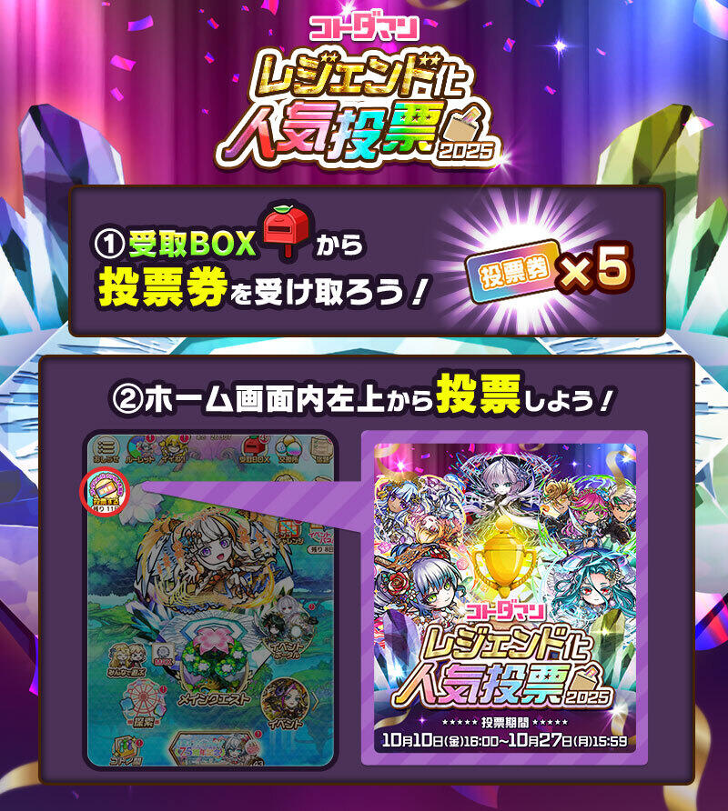 ※「コトダマンレジェンド化人気投票券」は受取BOXにお届けいたします。上記期間内にお受け取りください。