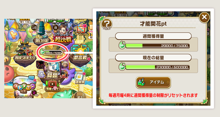 才能開花ptの所持数は、毎週月曜日の4:00にリセットされます。一週間に獲得できる上限は「75,000pt」です。