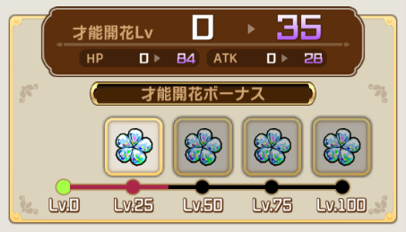 また、Lv.25、50、75、100に到達すると、それぞれ「才能開花ボーナス」を獲得することができます。