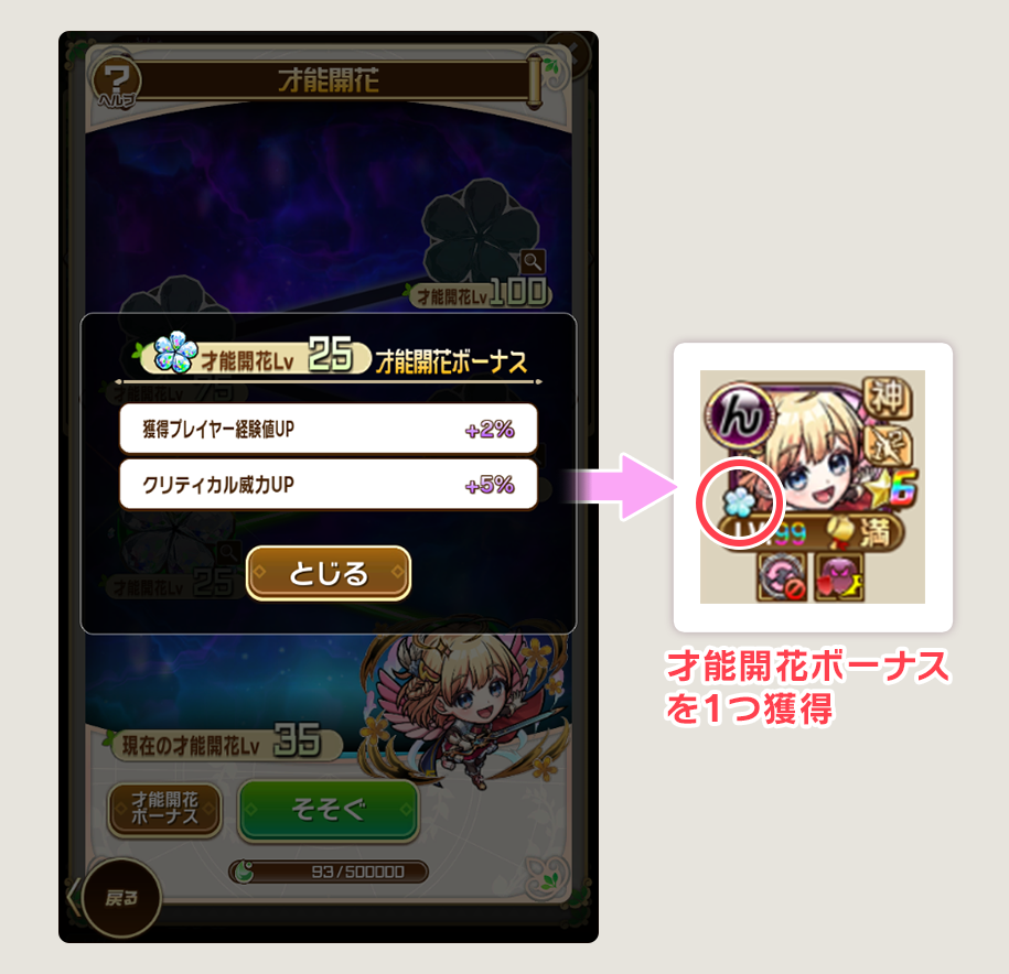 - 才能開花ボーナスの内容は、「才能開花」画面にて確認することができます。