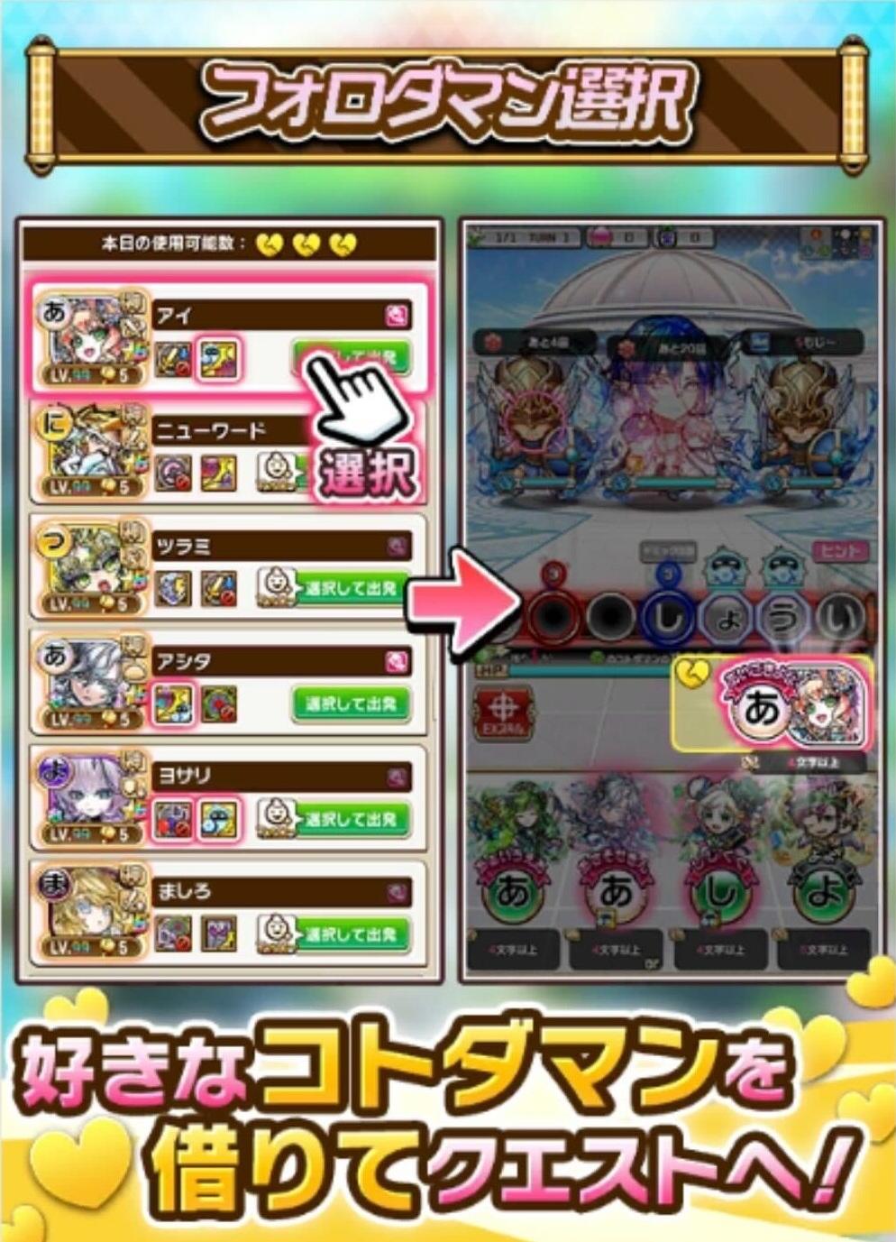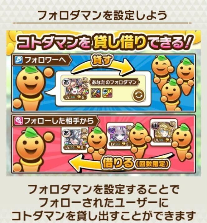 フォローしている相手が設定したコトダマンを借りてクエストに出発することができます。「フォロダマン」を借りた相手にお礼の気持ちを送りたい時は是非「イイね」を!