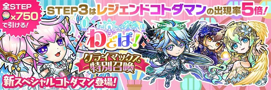 | 1回 | 「虹のコトダマ」の個数:750個 | 「特別召喚チケット」10枚 + 「わどぱ!クライマックス特別召喚専用おめで鯛」2個 |