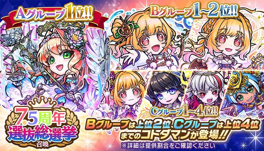12月16日(火)より、「コトダマンアワード2025」内の「7.5周年選抜総選挙」にて選ばれた、A・B・Cの3つのグループ上位のコトダマンが出現する「7.5周年選抜総選挙召喚」を開催!