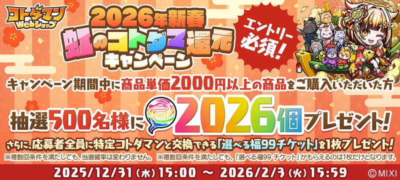 抽選で500名様に「虹のコトダマ」2,026個が当たるチャンス!さらに、応募者全員に「選べる福99チケット」1枚をプレゼント!