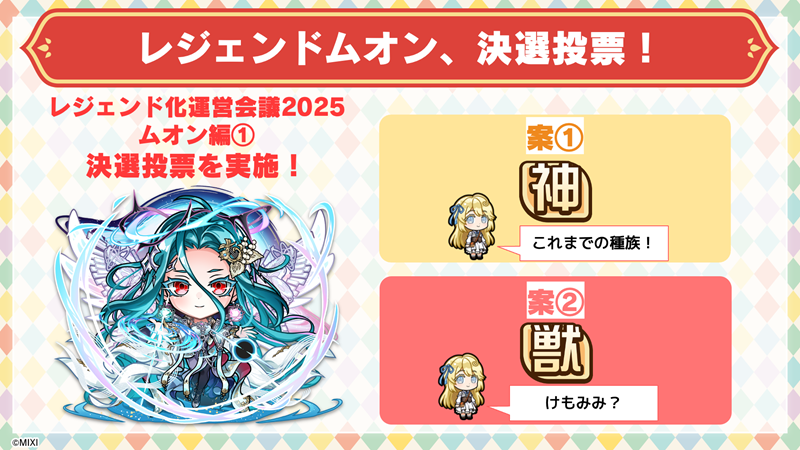 「レジェンド化運営会議2025 ムオン編①」にて上位に選ばれた「神種族」「獣種族」を対象に、決選投票を実施いたします。