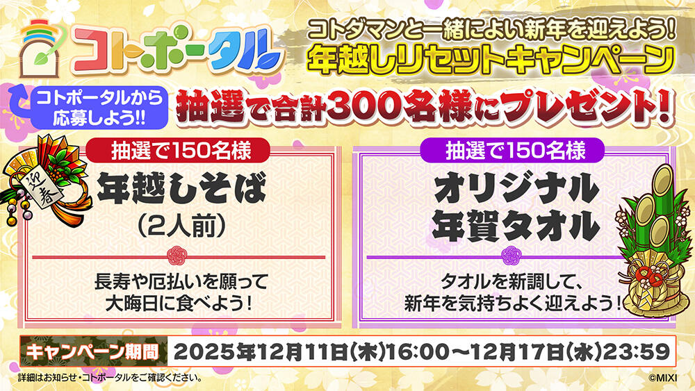 キャンペーン期間中、コトダマン公式コミュニティ「コトポータル」内の応募フォームよりご応募いただいた方の中から抽選で合計300名様に「年越しそば」または「オリジナル年賀タオル」をプレゼント!