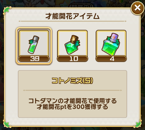 才能開花ptをそそぐ時に「コトノミズ」を消費すると、才能開花ptを追加することができます。