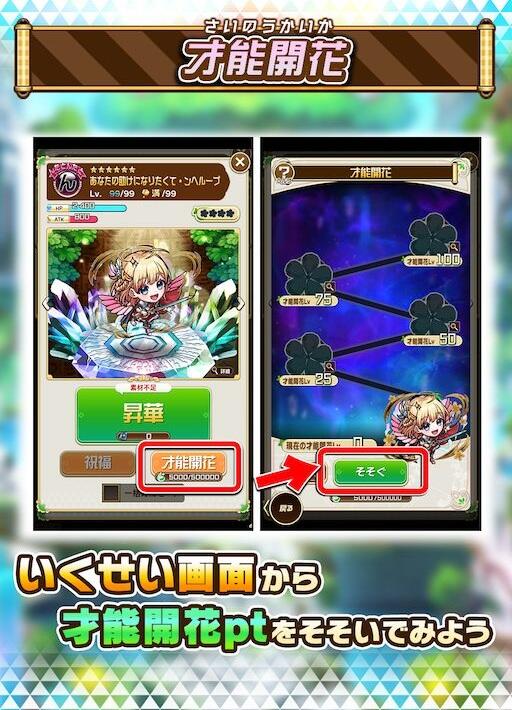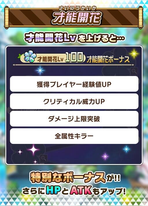 クエストをクリアして獲得した「才能開花pt」をそそぐことで「才能開花Lv」を上げ、すべてのコトダマンを強化することができる新たな育成要素が登場します。