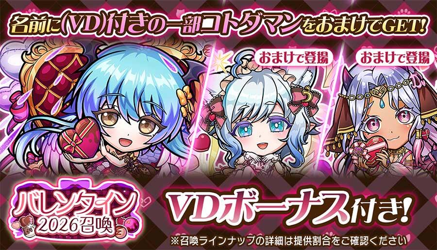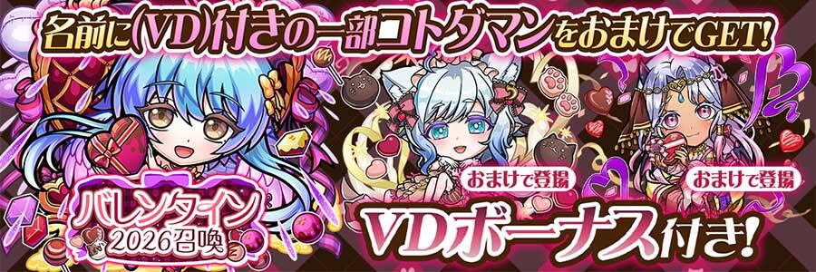 「VDボーナス」および「特別VDボーナス」が発生するごとに、確率で「★6 ごろにゃんチョコレート・うきよ(VD)」「★6 告白ラグジュアリー・カワユイシス(VD)」など、ラインナップ内のコトダマンいずれか1体を獲得することができます。