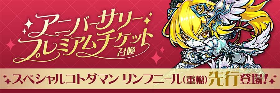 「アニバーサリーチケット交換所」で「アニバーサリープレミアム選抜の実」などと交換できる「アニバーサリーコトの実交換チケット」と、「リンフニール(重槍)」などと交換できる「アニバーサリーチケット」のおまけ付き!