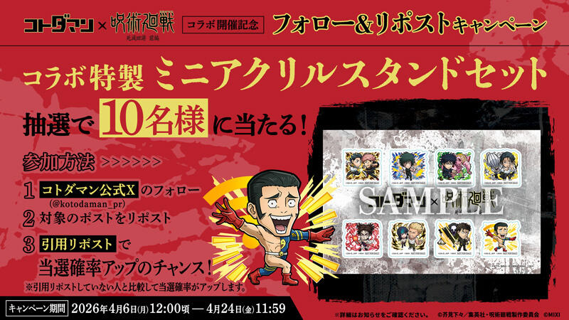 また、ハッシュタグ「#コトダマン呪術廻戦コラボ」を付けたポストをXに投稿してくださった方の中から抽選で5名様に、「TVアニメ『呪術廻戦』死滅回游 前編 コラボ召喚コトダマンセット」をプレゼントいたします。