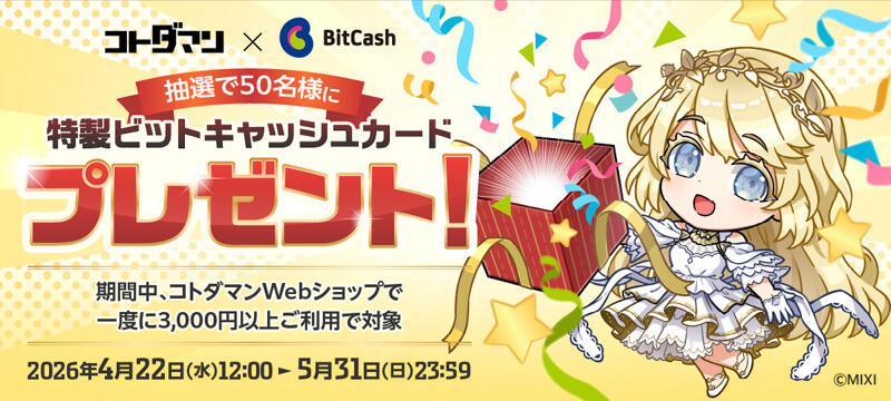 キャンペーン期間中、ビットキャッシュを使って1度に3,000円(税込)以上のお支払いをおこない、ビットキャッシュのキャンペーンページよりご応募をいただくと、抽選で50名様に『「コトダマン」デザイン特製ビットキャッシュカード1,000クレジット』をプレゼントいたします。