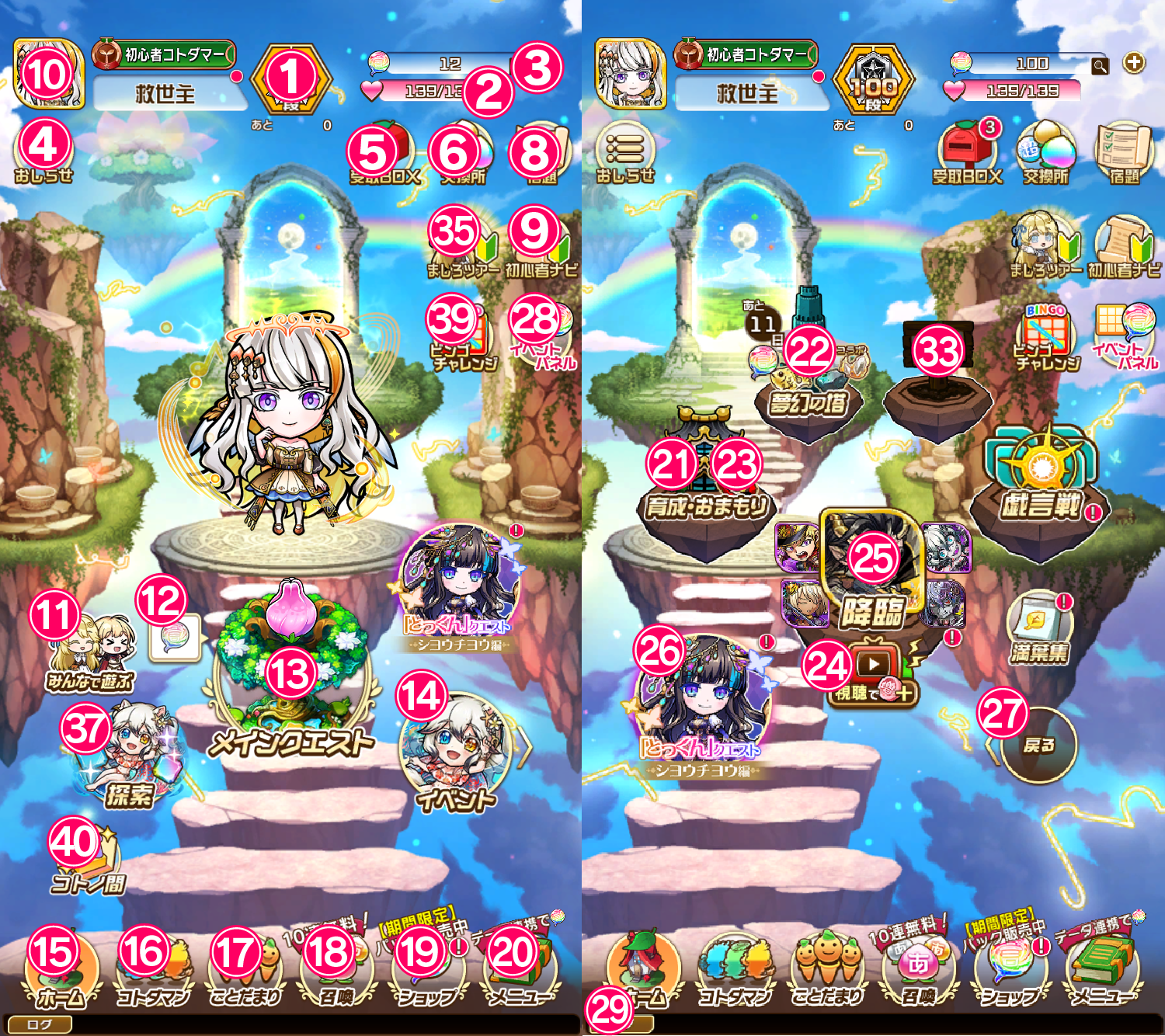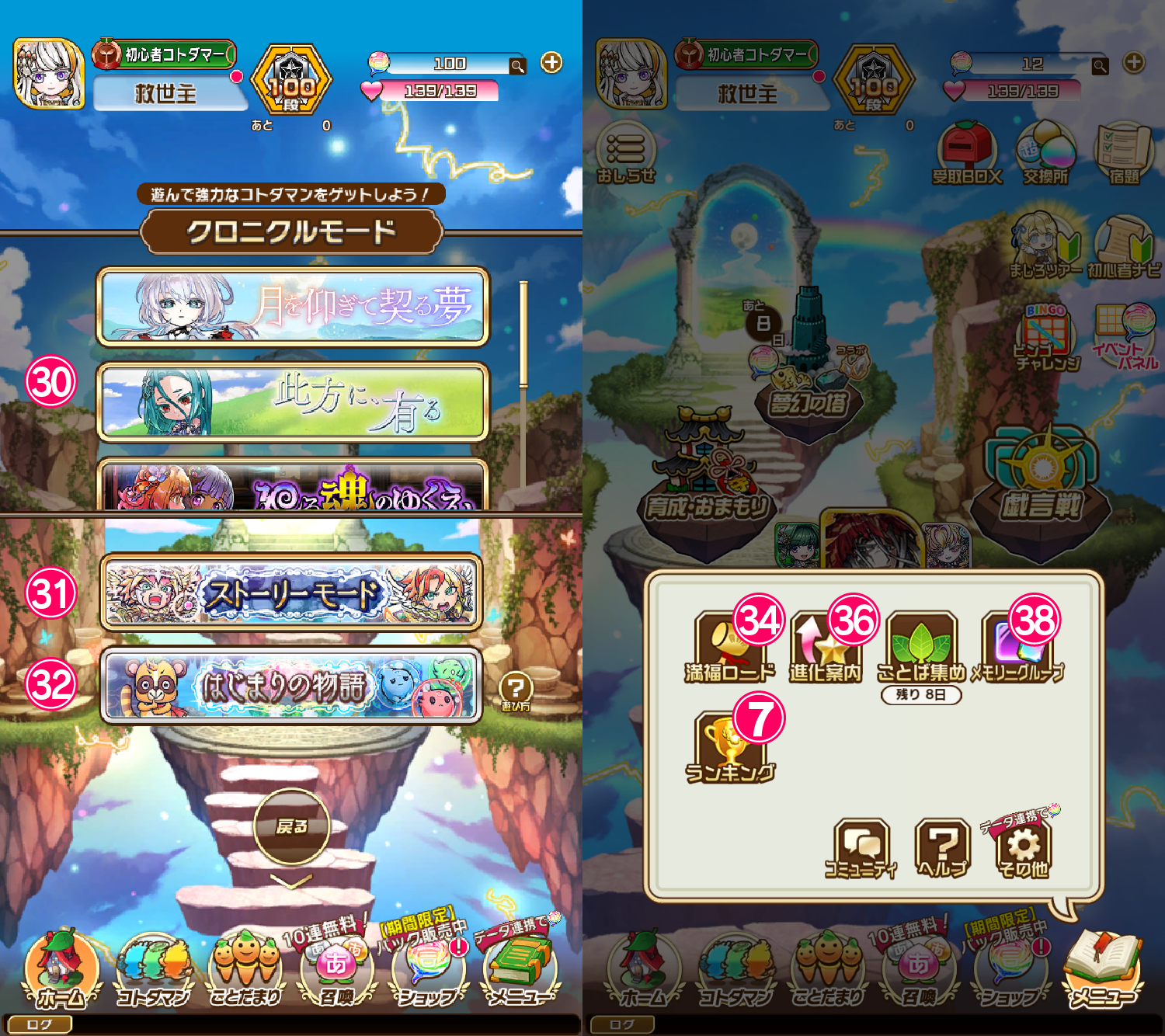 「虹のコトダマ」や、様々なアイテムがついているお得なパックなどを購入することができます。 - 「メニュー」内には各種設定画面に進むことができる「その他」をはじめ、ゲーム内各所への遷移ボタンが集約されています。