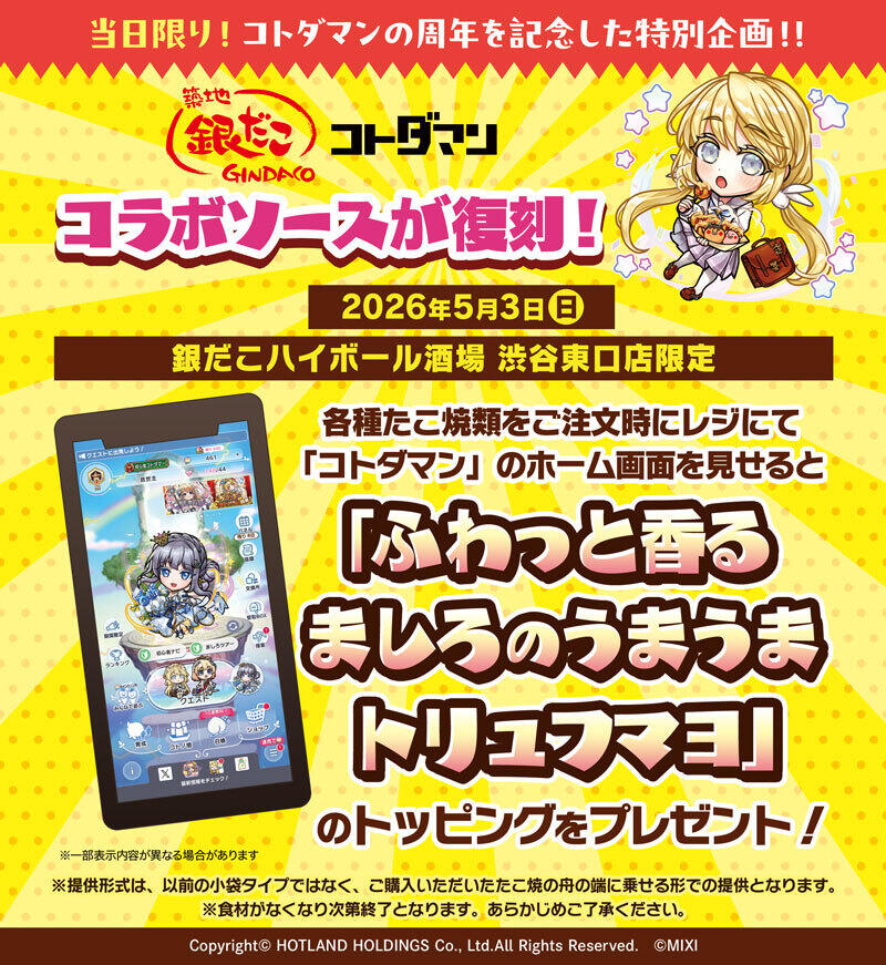 イベント会場からすぐ!「銀だこハイボール酒場 渋谷東口店」にてたこ焼類をご注文の際、コトダマンのホーム画面を提示すると「ふわっと香る ましろのうまうま トリュフマヨ」のトッピングをプレゼントいたします。